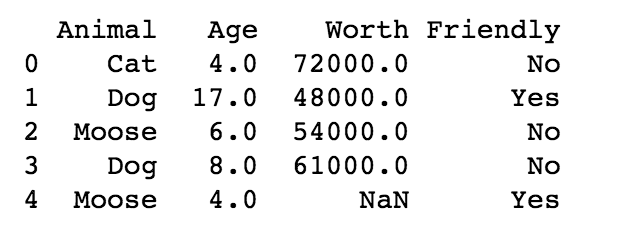 Remember when you’re looking at your dataset, the index starts at 0. If you’re trying to count the columns, start counting at 0, not 1. [:, 3] gets you the animal, age, and worth columns. 0 is the animal column, 1 is the age column, and 2 is the worth. You will get used to this counting system if you aren’t already!