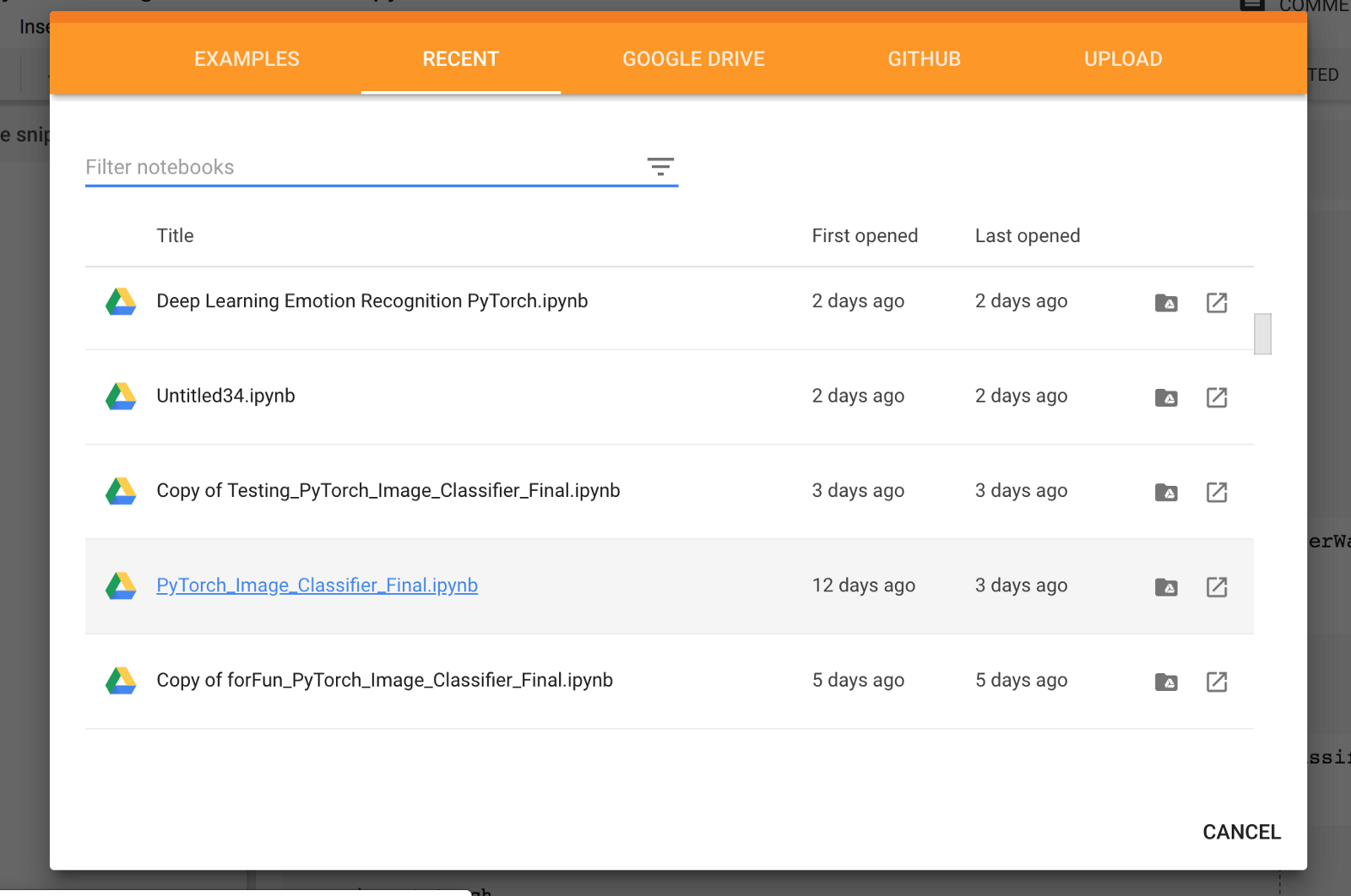 As you can see, you can open a recent file, files from your Google Drive, GitHub files, and you can upload a notebook right there as well.
