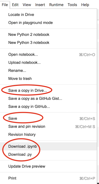 Saving your work is simple! You can do a good ol’ “command-s” or drop the “File” menu down to save. You can create a copy of your notebook by dropping “File” -> “Save a Copy in Drive.” You can also download your workbook by going from “File” -> “download .ipyb” or “download .py.”