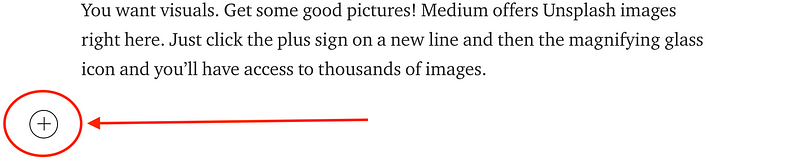 Whitespace is your friend. You want short paragraphs with lots of whitespace. You want visuals. Get some good pictures! Medium offers Unsplash images inside of your post. Just click the plus sign on a new line and then the magnifying glass icon and you’ll have access to thousands of images. All you have to do is search for an image that makes you happy.