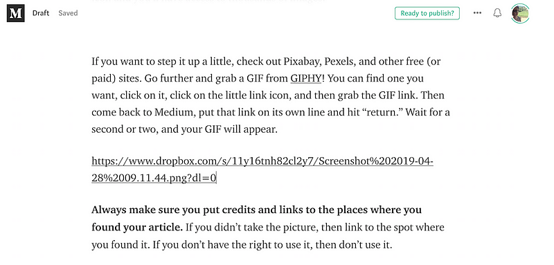 If you want to step it up a little, check out Pixabay, Pexels, and any other free (or paid) sites. Take it to the next level and grab a GIF from GIPHY! You can find one you want, click on the little link icon, and grab the GIF link. Then come back to Medium, paste that link on its own line and hit “return.” Wait for a second or two (or twenty…), and your GIF will appear like magic.
