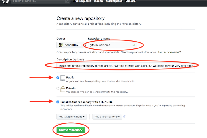 It’s a smart idea to include a README file with information about your project. You can create one at the same time that you create your repository with the click of a checkbox.